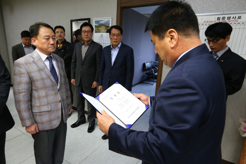 금일 (2016년 10월 31일) 중앙회 회장실에서 안동조합 윤동헌 전무이사의 재임용과 중앙회 사업부 4급 허창진의 3급 승진에 대한 임용장 교부를 실시하였다.