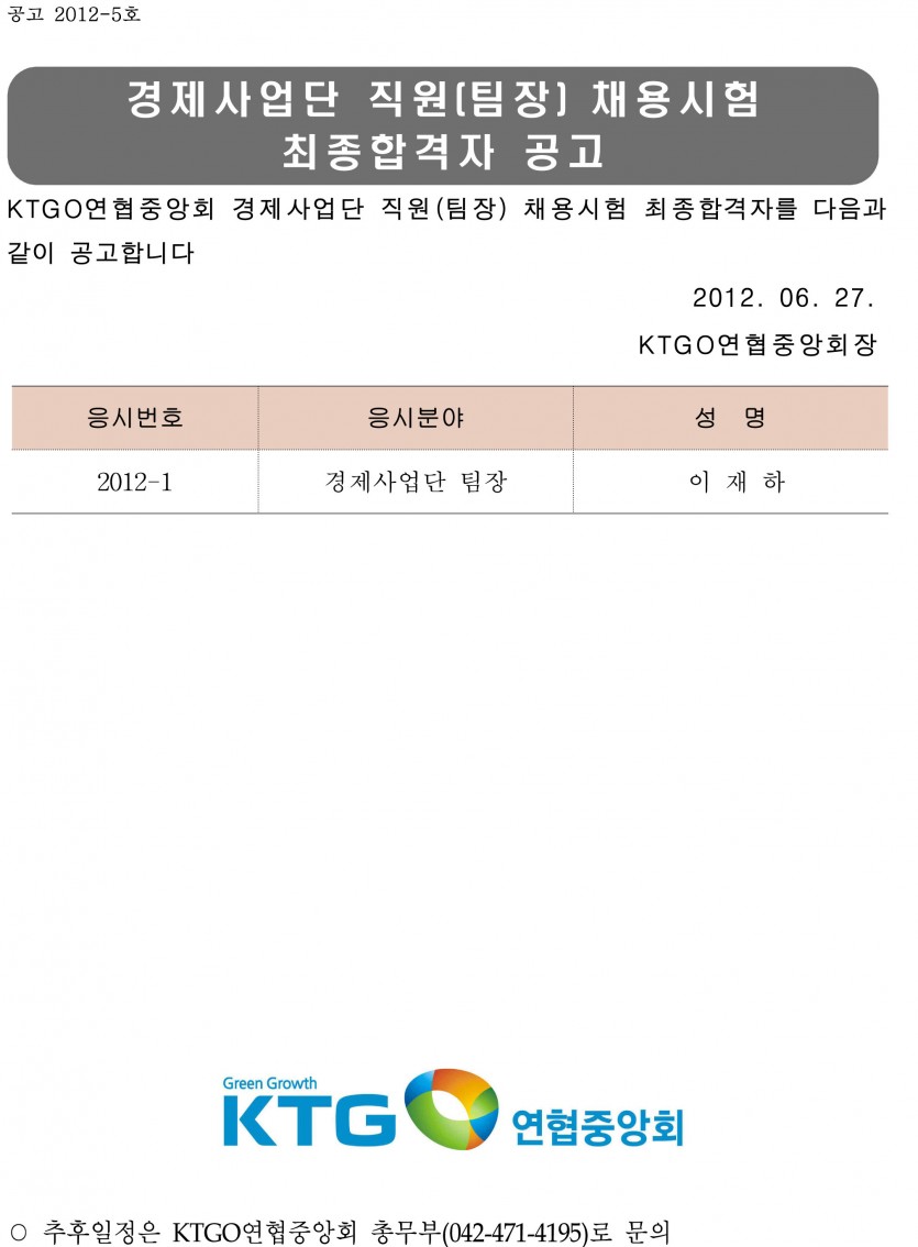경제사업단 직원(팀장) 채용시험 최종합격자 공고