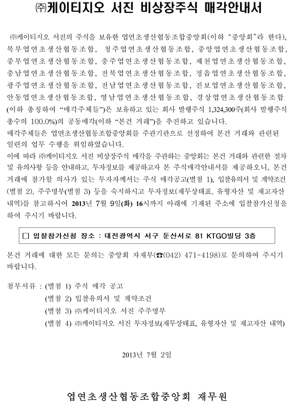 (주)케이티지오 서진 비상장주식 매각안내서 > 공지사항