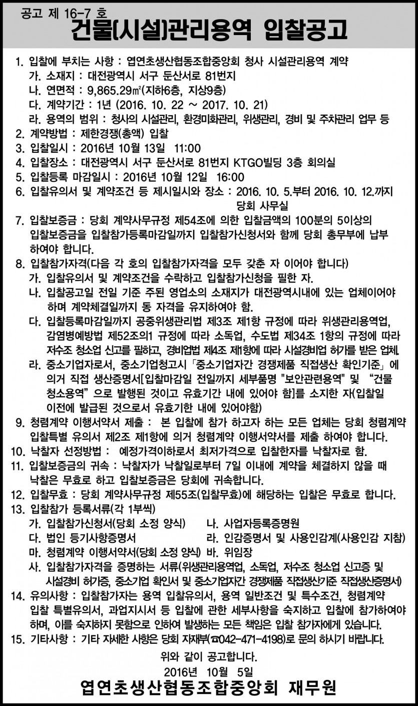 KTGO청사 시설관리용역 입찰공고 작성일2016-10-05 본문 KTGO청사 시설관리용역에 대한 공고와 시방서 및 관련서식입니다. 첨부파일 입찰관련_서식[0].hwp 청사_시설관리용역_시방서-2016년.hwp 이전글 다음글 목록